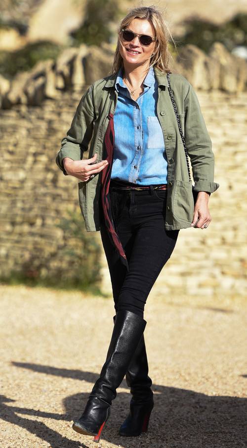 Kate has been wearing Khaki jackets as part of her festival look for decades. Paired in this picture with another trend she catapulted onto the high street - cut off denim hotpants worn here with a hip belt. The Khaki jacket can be dressed down, as she has done here, strolling through Glastonbury's fields, or dressed up with tall boots and skinny dark Denim.